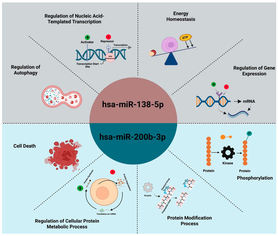Overview of biological processes regulated by hsa-miR-138-5p and hsa-miR-200b-3p. Together, these functional domains illustrate how each miRNA orchestrates distinct but complementary aspects of tumor cell biology—hsa-miR-138-5p primarily governs transcriptional and metabolic homeostasis in seminoma, while hsa-miR-200b-3p directs kinase-driven signaling and protein turnover in teratoma.