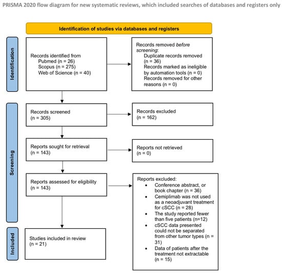 The strategy used for elaborating this review’s question was the PICO tool, which consists of the population (P), patients diagnosed with cutaneous squamous cell carcinoma; intervention (I), treatment with Cemiplimab in a neoadjuvant; comparison (C), none; outcomes (O), the course of the patient after the treatment; study type (S), controlled trials, retrospective cohort studies, systematic reviews, and case series. Studies were excluded if (a) Cemiplimab was not used as a neoadjuvant settings treatment for cSCC; (b) data of patients after the treatment were not extractable; (c) the study reported fewer than five patients; (d) the article type was a conference abstract, case report, or book chapter; or (e) cSCC data presented could not be separated from other tumor types. No restriction on the publication date was applied.