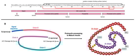 Structure of proinsulin and mature insulin. (A) The full coding amino acid sequence of human insulin showing all its features; (B) Structure of proinsulin and mature insulin showing the peptide chains, two disulfide bonds between the B-chain and the A-chain, and one disulfide bond of the A-chain. Created in Biorender.