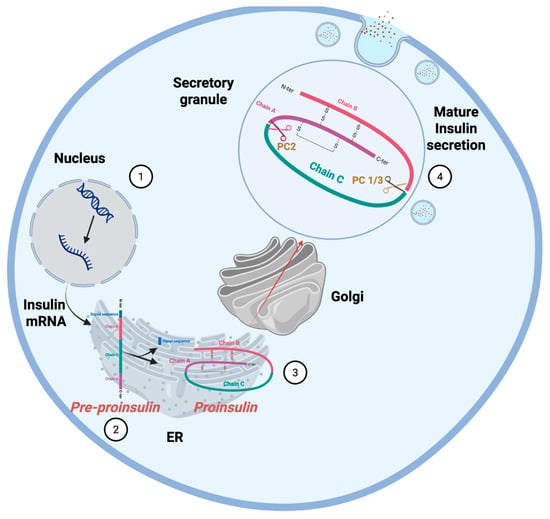 The synthesis of mature insulin begins with the transcription of the INS gene, producing preproinsulin mRNA that is translated by ribosomes on the rough endoplasmic reticulum (ER) into preproinsulin, a 110-amino acid precursor containing an N-terminal signal peptide (24 aa), B chain (30 aa), C-peptide (35 aa), and A chain (21 aa) (Figure 1 and Figure 2, steps 1 and 2) [12].