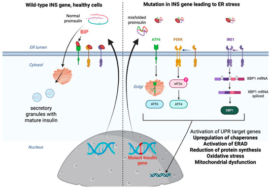 ER stress and unfolded protein response (UPR) activation in β-cells: Wild-type vs. INS mutant (MODY10) pathways. Created in Biorender.