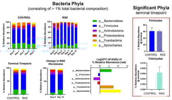 Effects of 8 Gy gut irradiation on gut microbiota at the Phyla level taxonomic classification. Phyla consisting of >1% total bacterial composition are shown for 8 Gy, with mean relative abundance changing over time for CONTROL and RAD groups. Log2 (FC) (FC = fold change) of relative abundance for RAD microbiota at d14 compared to baseline is shown. Firmicutes and Chlamydiae were both significantly altered by RAD at d14 vs. CONTROL.
