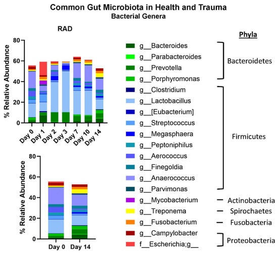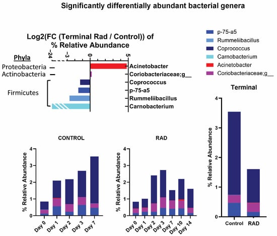 Altered gut microbiome 14 days post 8 Gy gut irradiation. Two phyla and six genera were identified to be significantly changed at the terminal timepoint comparing RAD and CONTROL swine microbiomes.