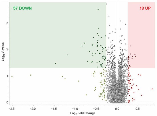 MS-proteomic analysis identified 8709 protein groups, with 7186 quantified, from 103,772 peptide groups sequenced from 220,589 peptide-spectral matches at 5% FDR. (see full list of identified proteins in Supplementary Data S1). Based on our thresholding parameters (adjusted p < 0.05; Log2 (Fold Change (FC)) = 0.26), a total of 18 proteins were increased and 57 proteins were decreased in abundance in the FCtx of RAD vs. CONTROL swine (see list for up- and down-regulated proteins in Supplementary Data S1). A volcano plot of the total increased (red square) and decreased (green square) proteins within our threshold parameters in RAD vs. CONTROL FCtx samples is shown in Figure 4. The TMT-MS raw data and analysis files have been uploaded to the publicly accessible repository MassIVE: MassIVE ID MSV000098819.