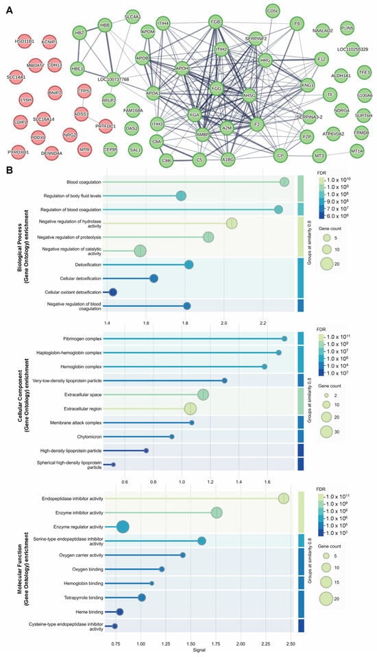The STRING database (https://string-db.org/) (accessed on 21 May 2025) is a powerful tool that uses data-mining to provide information regarding protein–protein interactions (known physical interactions and functional associations based on scientific literature, computational predictions from co-expression, genomic content, and experimental data), as well as offering network visualization of the strength of those interactions and functional enrichment analyses []. To explore potential associated protein interactions within our up- and down-regulated proteomic targets (72 proteins total input, with 66 identified against Sus scrofa in the STRING database), we used STRING to populate a network (Figure 5A), confirming that these protein interactors are predominantly involved in the inhibition and regulation of enzymatic activity (ITIH2, ITIH3, ITIH4), fibrinogen (FGG, FGB, FGA) and hemoglobin complexes (HBZ, HBE1, HBB), and blood coagulation (HRG, APOH, F2, F9, F12, SLC4A1) (Figure 5B).