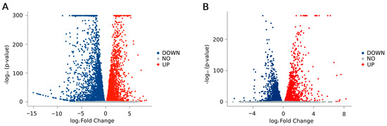 Volcano plots of differentially expressed genes: (A) WT (PI-PLC γ1 mRNA correctly spliced) vs. IR (PI-PLC γ1 mRNA with intron retention); (B) IRHPE (PI-PLC γ1 mRNA with intron retention treated with HPE) vs. IR. Reported are the negative log10-transformed adjusted p-values plotted against the log2 fold changes. The red dots represent the upregulated genes, the blue dots represent the downregulated genes, and the gray dots represent genes that were not statistically significant. Genes with adjusted p-values after Bonferroni correction < 0.05 were considered significantly modulated.