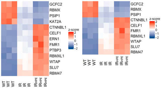 Heatmap showing the genes that were either upregulated in WT (PI-PLC γ1 mRNA correctly spliced) vs. IR (PI-PLC γ1 mRNA with intron retention) samples and downregulated in IRHPE (PI-PLC γ1 mRNA with intron retention treated with HPE) vs. IR samples (WT > IR, IR > IRHPE, decrease–decrease) or downregulated in WT vs. IR samples and upregulated in IRHPE (WT < IR, IR < IRHPE, increase–increase) vs. IR samples and involved in RNA splicing (left, n = 13) or RNA splicing via transesterification reaction (right, n = 10). The Z scores of gene expression are depicted as a gradient from blue (low expression) to red (high expression) (n = 3 biological replicates).