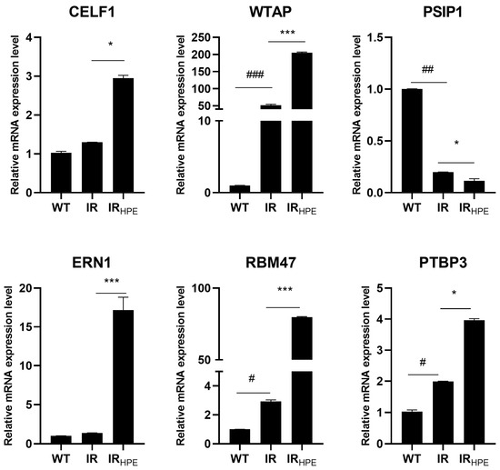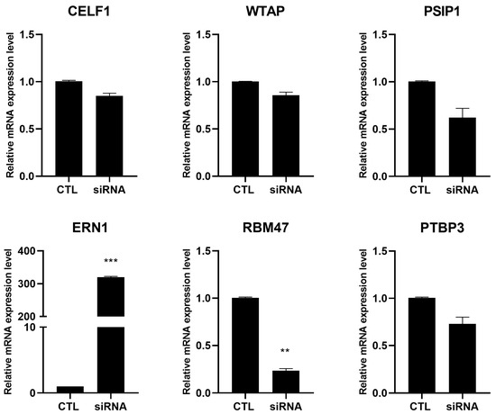 The selected six genes involved in splicing processes (CELF1, WTAP, PSIP1, ERN1, RMB47, and PTBP3) were analyzed at the mRNA level using RT-PCR to verify the consistency between the RNA-seq results and the mRNA levels of the modulated genes.