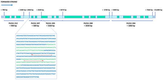 Schematic representation of the PI-PLC γ1 gene with retained introns. PI-PLC γ1-encoding gene (10,880 bp) is shown with the five regions containing the retained introns in green. The sequence reported in the frame corresponds to the PLCG1-207 region, described by the HAVANA group at the Wellcome Trust Sanger Institute (Cambridge, UK) and sequenced in our lab. Exon sequences are shown in blue, and intron sequences are shown in green. The red arrows, Fw and Rv, represent the position and sequences of RT-PCR primers.