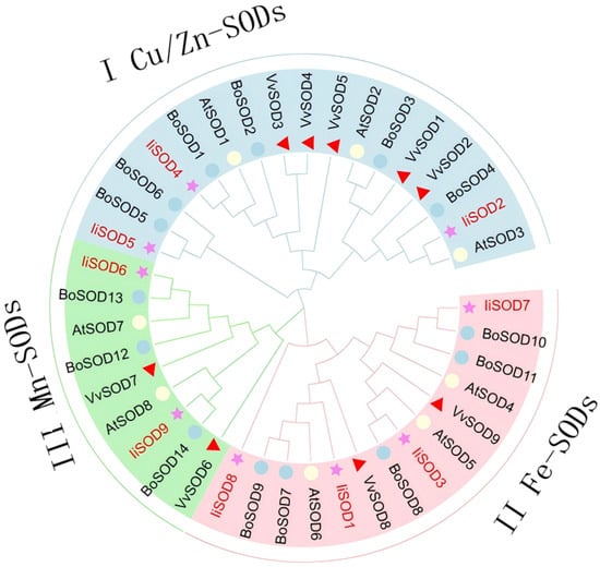 Phylogenetic trees are widely used to show the evolutionary relationships of gene families. Phylogenetic analysis of SOD protein sequences of I. indigotic (nine), A. thaliana (eight), Brassica oleracea (fourteen), and Vitis vinifera (nine) was used (Supplementary Table S1). Based on domain analysis and the phylogenetic tree, the SOD genes of all species were clustered into three major clades: Cu/Zn-SODs (I), Fe-SODs (II), and Mn-SODs (III), represented by light blue, pink, and light green, respectively (Figure 1). SOD protein sequences clustered in the same branch are more likely to exhibit functional similarity. The Cu/Zn-SOD group contained 17 SOD members (3 liSODs, 3 AtSODs, 6 BoSODs, and 5 VvSODs), the Fe-SOD included 14 members (4 liSODs, 3 AtSODs, 5 BoSODs, and 2 VvSODs), and the Mn-SOD group had 9 members (2 liSODs, 2 AtSODs, 3 BoSODs, and 2 VvSODs). The I. indigotica, A. thaliana, and B. oleracea belong to the cruciferous family, and the SOD family members are closest to the AtSOD and BoSOD gene family members in the phylogenetic tree. The results showed that the IiSOD, AtSOD, and BoSOD families were most closely related during evolution. Interestingly, the Cu/Zn-SOD and Fe-SOD groups of each species contained more SOD compared to the Mn-SOD group. In the Fe-SOD group, IiSOD8’s similarity to A. thaliana Fe-SOD (50%) was significantly higher than its similarity to A. thaliana Mn-SOD (20%).