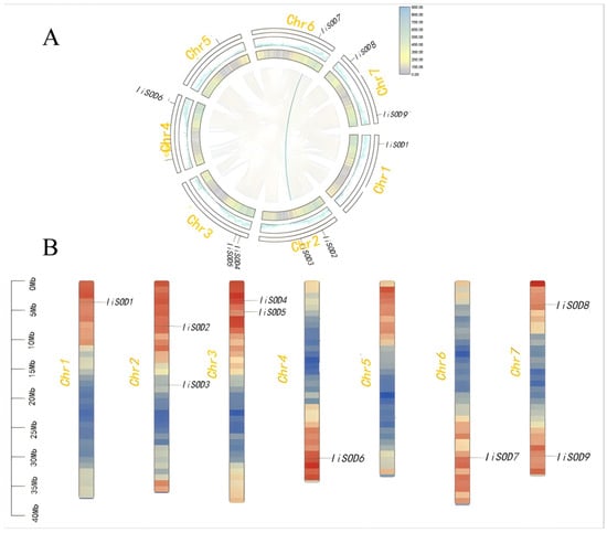 According to the genome annotation file of I. indigotica, we analyzed the relative position of 9 IiSODs on chromosomes. The results confirmed that 9 IiSOD genes were distributed on seven different chromosomes. According to the chromosome distribution of A. thaliana and the widely accepted naming system, the IiSOD candidate genes were named IiSOD1-9. Among them, Chromosomes 2, 4, and 7 each have two genes distributed, and strangely, there is no gene distribution on chromosome 5. The results showed that the positional distribution of IiSOD genes was irregular and, in addition, no tandem duplication events were found (Figure 2B). Collinearity analysis revealed that a segmental duplication occurred in one gene pair (IiSOD3 and IiSOD7) in the IiSOD genes (Figure 2A), and they both belonged to the Fe-SOD subfamily. IiSOD3 and IiSOD7 may have undergone subfunctionalization, neofunctionalization or functional redundancy.