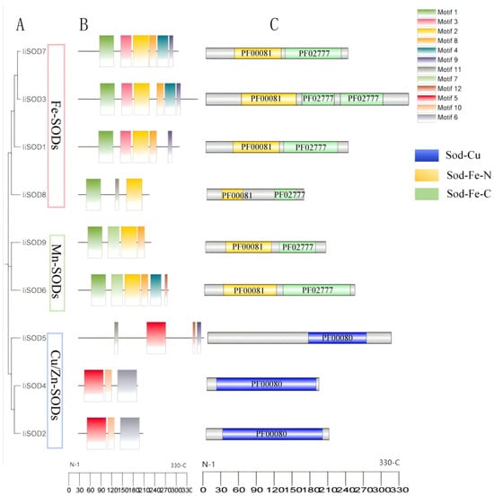 Phylogenetic tree, conserved motifs, and domain analysis of IiSOD. (A) Neighbor-joining tree of IiSODs protein. (B) IiSOD conserved motif analysis. (C) Conserved structure domains of IiSOD. The blue, yellow, and green rectangles indicate the SOD_Cu structural domain (PF00080), SOD_Fe_N structural domain (PF00081), and SOD_Fe_C structural domain (PF02777), respectively.