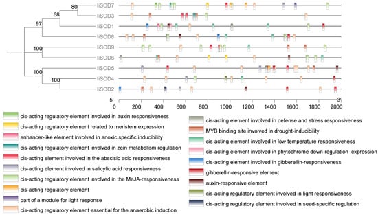 The cis-regulatory elements in the promoter region of the IiSOD gene family. Different colors in the IiSODs promoter region indicate cis-elements with various functions.