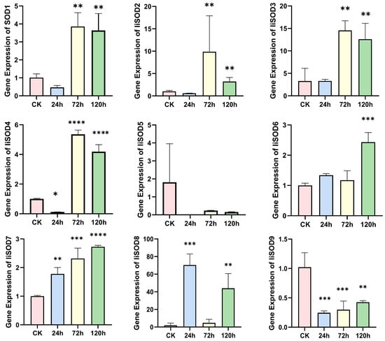 Expression level of the IiSOD gene under alkaline stress. Data are means (mean ± SD) of three replicates. The significance of IiSOD gene expression level was analyzed by one-way analysis of variance (ANOVA) and Tukey’s multiple comparison test (* p < 0.05, ** p < 0.01, and *** p < 0.001, **** p < 0.0001).