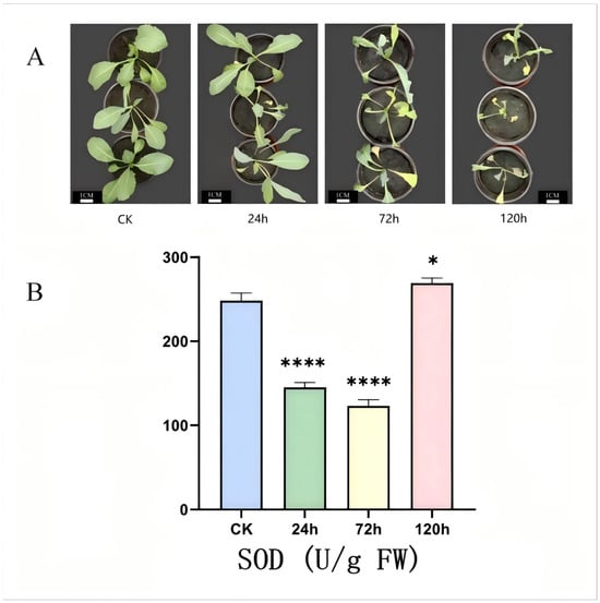 The alkaline salt stress caused by NaHCO3 and Na2CO3 usually leads to the increase in pH value in the rhizosphere environment of plants, which not only destroys the physiological function of roots but also leads to the disintegration of root cells and even the destruction of root structure, thus affecting the growth and development of plants, the quality of medicinal materials and physiological and biochemical indexes []. The most common stress symptoms of plants under alkaline stress are chlorotic leaves and reduced plant growth to a certain extent. For example, the chlorophyll content index (CCI) of blueberry leaves in alkaline soil showed a downward trend, and the concentration of some trace elements in leaves was unbalanced, indicating that the veins of leaves were chlorotic in alkaline soil []. Under alkaline stress, rice causes severe damage to the growth of old leaves but has little effect on the development of young leaves []. Studies have shown that three genes, GmFSD3, GmFSD4, and GmFSD5, in soybean (Glycine max (L.) Merr.) roots were significantly induced under alkaline stress []. Under low temperature, high temperature, and salt stress, the two genes HbCSD2 and HbCSD4 in mature leaves of Hevea brasiliensis were significantly up-regulated to enhance stress resistance [].