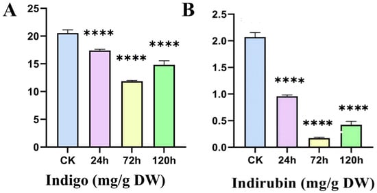 Indole alkaloids are secondary metabolites produced during plant growth and have essential ecological functions in adapting to environmental stress. Indole alkaloids are mainly enriched in the leaves of I. indigotica, including indigo, indirubin, tryptanthrin, etc. []. According to the 2020 edition of the Chinese pharmacopeia, indigo and indirubin are the quality control components of I. indigotica Fort. Indigo and indirubin can be natural antioxidants in the food or pharmaceutical industry []. Changes in the content of indigo and indirubin in I. indigotica under alkaline stress treatments (0 h (CK), 24 h, 72 h, 120 h) were detected using HPLC. The chromatograph was a Thermo U3000 series, and the column was an Agilent C18 (250 mm × 4.6 mm, five μm particle size). Indigo and indirubin control products were purchased from Sichuan Vicki Biotechnology Co., Ltd. (Chengdu, China), and about 0.5 g of powdered I. indigotica leaves from the alkaline stress treatment groups were precisely weighed and dissolved in 10 mL of N, N-dimethylformamide solution. Vortex shaking for about 5 min, ultrasonic extraction for 45 min (power 300 W, frequency 80 Hz), cooled to room temperature, and N, N-dimethylformamide was added to the scale. After shaking well, the test solution was filtered through a 0.45 μm organic microporous filter membrane to determine the test solution. The elution procedure was based on a methanol (A)-ultrapure water (B) gradient as the mobile phase []. Isocratic elution (0–20 min, 75:25); Flow rate: 1.0 mL/min; Detection wavelength: 290 nm; Column temperature: 25 °C; Injection volume: 10 μL [].
