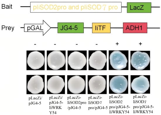 The recombinant plasmid was constructed using homologous recombination, and homology arm primers were designed using the Tiangen Seamless Cloning Primer Online Tool (Available online: http://yw.tiangen.com/) based on the CDS sequence of the IiWRKY54 transcription factor and the pJG4-5 vector sequence 20 bp above and below the EcoRI restriction site. The W-box fragment sequences of the promoter regions of the two IiSOD genes and the pLacZi vector sequence of 20 bp up and down the EcoRI restriction site were used to design homologous arm primers. The primer sequences for this experiment are detailed in Supplementary Table S3. After obtaining the target gene, the recombinant vector was constructed by the constant temperature one-step method, and the two IiSOD target genes were ligated with the linearized pLacZi vector. The IiWRKY54 gene was ligated to the linearized pJG4-5 vector (pLacZi and JG4-5 had Amp resistance from Coolaber, Beijing, China). The bait vector constructed by pLacZi-IiSOD2 and pLacZi-IiSOD7, and the prey vector constructed by pJG4-5-IiWRKY54 were co-transformed into the EGY48 yeast strain (purchased from Shanghai Weidi Company (Shanghai, China)). No-load pLacZi-no-load pJG4-5, no-load pJG4-5-pLacZ-IiSOD2, no-load pJG4-5-pLacZ-IiSOD7, and pJG4-5-IiWRKY54-no-load pLacZi were transformed into the EGY48 yeast strain as negative controls to exclude false negative results. The transformed yeast was plated on SD/-Trp-Ura-Broth medium and cultured at 30 °C for 3-5 days. The positive bacteria were selected and cultured in SD/-Trp-Ura-Broth medium, and the plate was coated with chromogenic medium and cultured at 30 °C for 1–3 days. The interaction results were determined by observing the color change in the colony.