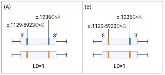 (A) Distribution of complete LD of 45 cases for heterozygous samples. (B) Distribution of the case of incomplete LD, where the variant c.1236G>A is present in heterozygosis and the variant c.1129-5923C>G is present in homozygosis. The reference allele for both variants is represented in blue, and the alternative allele (benign or pathogenic) is marked in orange.