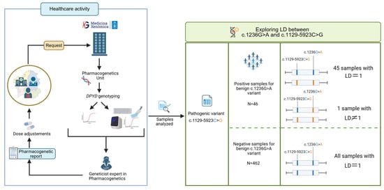 Samples analyzed in this report are the result of the healthcare activity performed by the Pharmacogenetics Laboratory of the Galician Public Foundation for Genomic Medicine (FPGMX) (Figure 2) []. In order to test the hypothesis of LD = 1 between the c.1236G>A and c.1129-5923C>G variants, a total of 46 patients positive for the c.1236G>A variant, mostly diagnosed with colorectal cancer but also with breast, rectal, or pancreatic cancer (17 females and 29 males), heterozygous for c.1236G>A, were specifically tested for the variant c.1129-5923C>G. Additionally, linkage disequilibrium was also evaluated in 462 samples that were negative for the c.1236G>A variant (Figure 2).