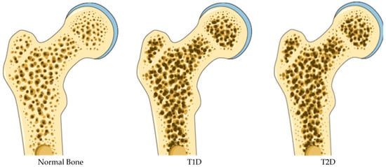 Cartoon depicting bone quality in diabetes, Adapted from SMART—Servier Medical ART CC4 License. BMD is generally decreased in T1D and normal or increased in T2D. Altered bone structure in T1D bone appears osteoporotic, whereas in T2D includes increased cortical porosity and reduced cortical density.