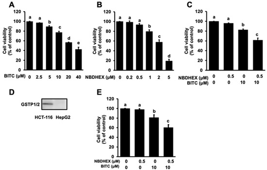 Enhancing effect of NBDHEX on BITC-induced antiproliferation in human colorectal cancer HCT-116 cells and human liver cancer HepG2 cells. (A) HCT-116 cells were treated with BITC at the indicated concentrations for 24 h. (B) NBDHEX was used to treat the cells for 24 h. (C) After pretreatment with NBDHEX (0.5 μM) for 1 h, cells were treated with BITC (10 μM) for 24 h. Cell viability was determined using the MTT assay. (D) Basal expression of GSTP1/2 in HCT-116 cells and HepG2 cells. (E) After HepG2 cells were pretreated with NBDHEX (0.5 μM) for 1 h, they were treated with BITC (10 μM) for 24 h. Cell viability was determined using the MTT assay. The different letters over the bars correspond to significant differences between treatments for each condition (p < 0.05, Tukey’s HSD, n = 3).