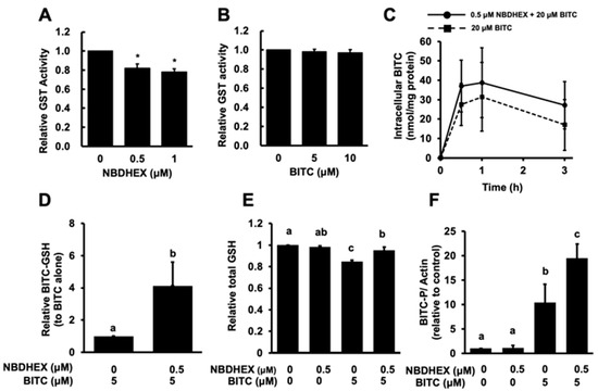 Modulatory effect of NBDHEX on BITC metabolism. Effects of NBDHEX (A) and BITC (B) on total GST activity. The total GST activity was determined using the CDNB assay. * p < 0.05 vs. control, Student’s t-test (n = 3). (C) Effect of NBDHEX on the intracellular BITC level. After pretreatment with NBDHEX (0.5 μM) for 1 h, cells were treated with BITC (20 μM) for 0.5, 1, and 3 h. The intracellular level of BITC was evaluated using the cyclocondensation assay. (D) Effect of NBDHEX on the BITC–GSH conjugate level in the cells. After pretreatment with NBDHEX (0.5 μM) for 1 h, cells were treated with BITC (5 μM) for 1 h. The BITC–GSH level was quantified using LC–MS/MS. (E) Effect of NBDHEX on the GSH level in the cells. After pretreatment with NBDHEX (0.5 μM) for 1 h, cells were treated with BITC (5 μM) for 1 h. The total GSH level was quantified using the DTNB-glutathione reductase assay. (F) Effect of NBDHEX on the level of BITC-modified proteins. After pretreatment with NBDHEX (0.5 μM) for 1 h, cells were treated with BITC (20 μM) for 1 h. The BITC-modified proteins were analyzed by western blotting. The different letters over the bars correspond to significant differences between treatments for each condition (p < 0.05, Tukey’s HSD, n = 3).