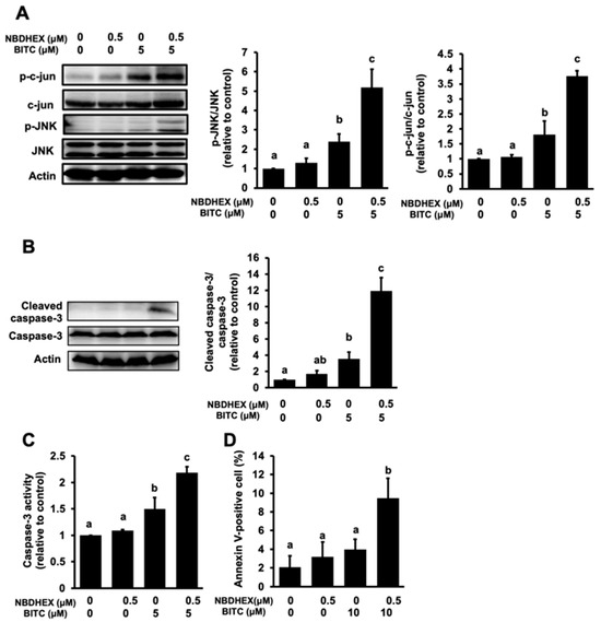 Enhancing effect of NBDHEX on BITC-induced apoptosis and its signaling pathways. (A) Enhancement of BITC-induced activation of the JNK pathway by NBDHEX. After pretreatment with NBDHEX (0.5 μM) for 1 h, cells were treated with BITC (5 μM) for 1 h. The phosphorylated and total protein levels of c-jun and JNK as well as actin were analyzed with western blotting. (B,C) NBDHEX enhanced the BITC-induced caspase-3 activation. After pretreatment with NBDHEX (0.5 μM) for 1 h, cells were treated with BITC (5 μM) for 24 h. Caspase-3, cleaved caspase-3, and actin were analyzed with western blotting (B). The caspase-3 activity was assessed with an enzyme assay using a substrate specific for caspase-3 (C). (D) Effects of NBDHEX and BITC on the induction of apoptosis. After pretreatment with NBDHEX (0.5 μM) for 1 h, cells were treated with BITC (10 μM) for 24 h. The percentage of the cell population that exhibited apoptotic characteristics was estimated using a commercially available apoptosis detection kit (Annexin V-FITC Apoptosis Detection Kit, Nacalai Tesque Inc., Kyoto, Japan) with observations performed using a fluorescence microscope (Biozero BZ-8000, KEYENCE, Osaka, Japan). The different letters over the bars correspond to significant differences between treatments for each condition (p < 0.05, Tukey’s HSD, n = 3).