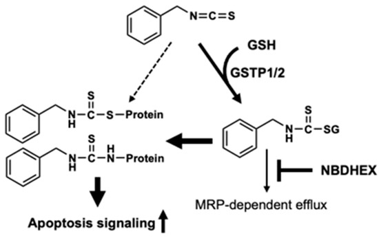 Increased drug metabolism and elimination are prominent mechanisms mediating multidrug resistance (MDR) to not only chemotherapy drugs but also anti-cancer natural products, such as benzyl isothiocyanate (BITC). To evaluate the possibility of combined utilization of a certain compound to overcome this resistance, we focused on glutathione S-transferase (GST)-dependent metabolism of BITC. The pharmacological treatment of a pi-class GST-selective inhibitor, 6-(7-nitro-2,1,3-benzoxadiazol-4-ylthio)hexanol (NBDHEX), significantly increased BITC-induced toxicity in human colorectal cancer HCT-116 cells. However, NBDHEX unexpectedly increased the level of the BITC–glutathione (GSH) conjugate as well as BITC-modified proteins, suggesting that NBDHEX might increase BITC-modified protein accumulation by inhibiting BITC–GSH excretion instead of inhibiting GST. Furthermore, NBDHEX significantly potentiated BITC-induced apoptosis with the enhanced activation of apoptosis-related pathways, such as c-Jun N-terminal kinase and caspase-3 pathways. These results suggested that combination treatment with NBDHEX may be an effective way to overcome MDR with drug efflux and thus induce the biological activity of BITC at lower doses.
