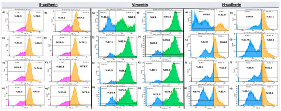 EMT marker expression in PANC-1 cells after 72 h treatment (flow cytometry). Subpanels show: E-cadherin (A–H), Vimentin (A–H), and N-cadherin (A–H). Flow cytometry histograms correspond to the quantitative data presented in Table 5, where groups sharing the same letter do not differ significantly, and groups marked with different letters show statistically significant differences (p < 0.05).