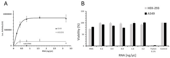 (A) Luciferase activity (LU) in HEK-293 (grey square) and A549 (black triangle) cells following treatment with LNP-1 at increasing mRNA doses (0.2, 0.4, 0.8, 1.6, and 3.2 ng/μL). Naked FLuc mRNA (naked RNA, empty triangle and empty square for HEK-293 and A549 respectively) and untreated cells (Ctl) were included as negative controls. Values represent the mean ± standard error of the mean for three independent luciferase activity assays. (B) Cell viability assessed by MTT assay in HEK-293 (grey) and A549 cells (black) treated with LNP-1 across a range of mRNA doses (0.2, 0.4, 0.8, 1.6, and 3.2 ng/μL). Naked FLuc mRNA (RNA), Triton-treated cells (positive control for cytotoxicity), and untreated cells (Ctl) were used as controls. Values represent the mean ± standard error of the mean for three independent luciferase activity assays.