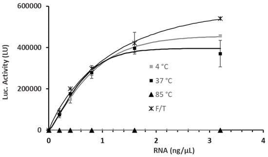 Luciferase activity (LU) in A549 cells treated for 24 h with LNP-2 formulations across a range of mRNA doses (0.2, 0.4, 0.8, 1.6, and 3.2 ng/μL), and subjected to different storage conditions: +4 °C (grey squares), +37 °C (black squares), +85 °C (black upward triangles), and repeated freeze–thaw cycles (black asterisks). Untreated cells (Ctl) were included as a negative control. Values represent the mean ± standard error of the mean for three independent luciferase activity assays.