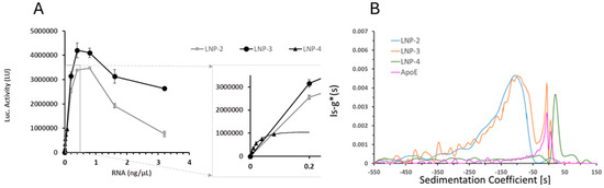 (A) Luciferase activity (LU) in A549 cells treated with different LNP formulations: cells were treated with LNP-2 (grey squares), LNP-3 (black circles) at a dose of 0.2, 0.4, 0.8, 1.6, and 3.2 ng/μL, and LNP-4 (black triangles) at a dose of 0.005, 0.01, 0.02, 0.04, and 0.08 ng/μL for 24 h. Values represent the mean ± standard error of the mean for three independent luciferase activity assays. (B) Sedimentation coefficient distribution profiles generated with the ls-g*(s) model of Sedfit40 of LNP-2 (blue), LNP-3 (orange), LNP-4 (green), and ApoE protein alone (pink), as determined by analytical ultracentrifugation (AUC). The analysis reveals differences in particle density and integrity among the formulations.