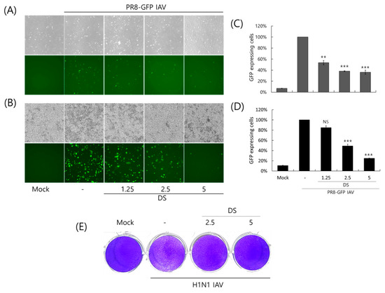 Antiviral effect of DS against H1N1 IAV infection. (A–D) DS at the indicated concentrations and PR8-GFP IAV (10 MOI) were co-incubated for 1 h at 4 °C. The mixtures were added to A549 (A,C) or RAW 264.7 (B,D) cells for 2 h at 37 °C. The cells were washed with PBS and further incubated for 24 h at 37 °C. (A,B) GFP expression in the cells infected by IAV was observed using a fluorescence microscope with 200× magnification. (C,D) The cells were fixed with paraformaldehyde, and the levels of GFP expression were detected using flow cytometry. (E) H1N1 IAV (10 MOI) and DS (2.5 or 5 µM) were mixed at 4 °C for 1 h and cotreated with MDCK cells at 37 °C for 1 h. After washing, the cells were overlaid with 1.5% agarose containing 1 µg/mL trypsin-treated TPCK and incubated for 72 h. The cells were fixed with paraformaldehyde and stained with 1% crystal violet. The data denote the mean ± standard deviation, based on triplicate experiments. Statistical significance was evaluated via Student’s unpaired t-test. *** p < 0.001 and ** p < 0.005 compared with PR8-GFP IAV-infected group; Mock, medium only; NS, no significance.