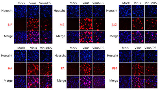 Because DS exerted strong inhibitory efficacy against IAV infection, as shown in Figure 2, we next investigated whether DS influences the IAV protein expression using immunofluorescence analysis. H1N1 IAV, in the presence and absence of DS, was infected in A549. At 24 h post-infection, the cells were fixed with paraformaldehyde. The expressions of IAV proteins, including NP, M2, NS1, HA, PA, and PB1, were detected using red color Alexa 594-tagged antibodies. The nuclei were stained in blue with Hoechst 33342. Figure 3 shows that DS potently represses all IAV proteins, consistent with the results of Figure 2.