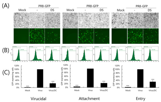 To investigate the effect of DS on the influenza viral attachment, entry, or virucidal stages, we used different incubation conditions for the cotreatment of DS and IAV. For attachment stages, PR8-GFP IAV (10 MOI) and DS (5 µM) were incubated with RAW 264.7 cells for 30 min at 4 °C. After washing with PBS to remove the unbound virus and DS, the cells were further incubated for 24 h at 37 °C. For the entry stage, PR8-GFP IAV was added to the cells for 30 min at 4 °C. After washing the cells with PBS, DS was added to the cells for 30 min at 37 °C. The cells were further incubated for 24 h at 37 °C after removal of the virus and DS. To check the virucidal effect of DS, PR8-GFP IAV and DS were co-incubated for 30 min at 4 °C. The virus and DS mixture were added to the cells for 30 min at 37 °C. After removal of DS and the virus with PBS washing, the cells were further incubated for 24 h at 37 °C. The GFP expression via IAV infection was detected using fluorescent microscopy at 200× magnification and flow cytometry.