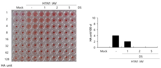 Hemagglutinin is a protein that is important for IAV to bind to and enter cells, and it induces the hemagglutination of red blood cells. Because DS exhibited a strong suppressive effect on IAV binding and penetration into the cells, as presented in Figure 4, we next examined whether DS influences hemagglutination by IAV HA proteins using chicken red blood cells. Figure 5 shows that the H1N1 IAV-infected control in the absence of DS causes agglutination of the RBC, whereas DS inhibits hemagglutination from 1 µM. The H1N1 IAV-infected control showed 4 HA units. However, HA units in the presence of 1 µM DS were two-fold lower than those in the IAV-infected control. In particular, 2 and 5 µM of DS completely prevented hemagglutination caused by IAV infection. These results indicate that DS inhibits the HA protein, blocking IAV attachment and penetration into the cells.