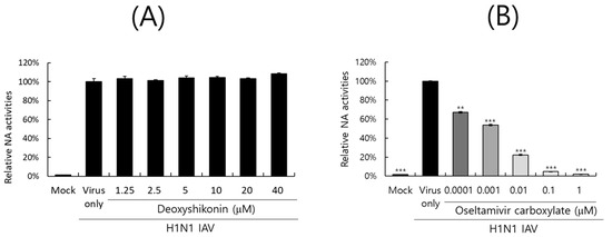 The data were presented as the mean ± standard deviation based on three independent experiments. Statistical significance was assessed via Student’s unpaired t-test. Statistical significance was defined as *** p < 0.001 and ** p < 0.005 compared with the IAV-infected group.