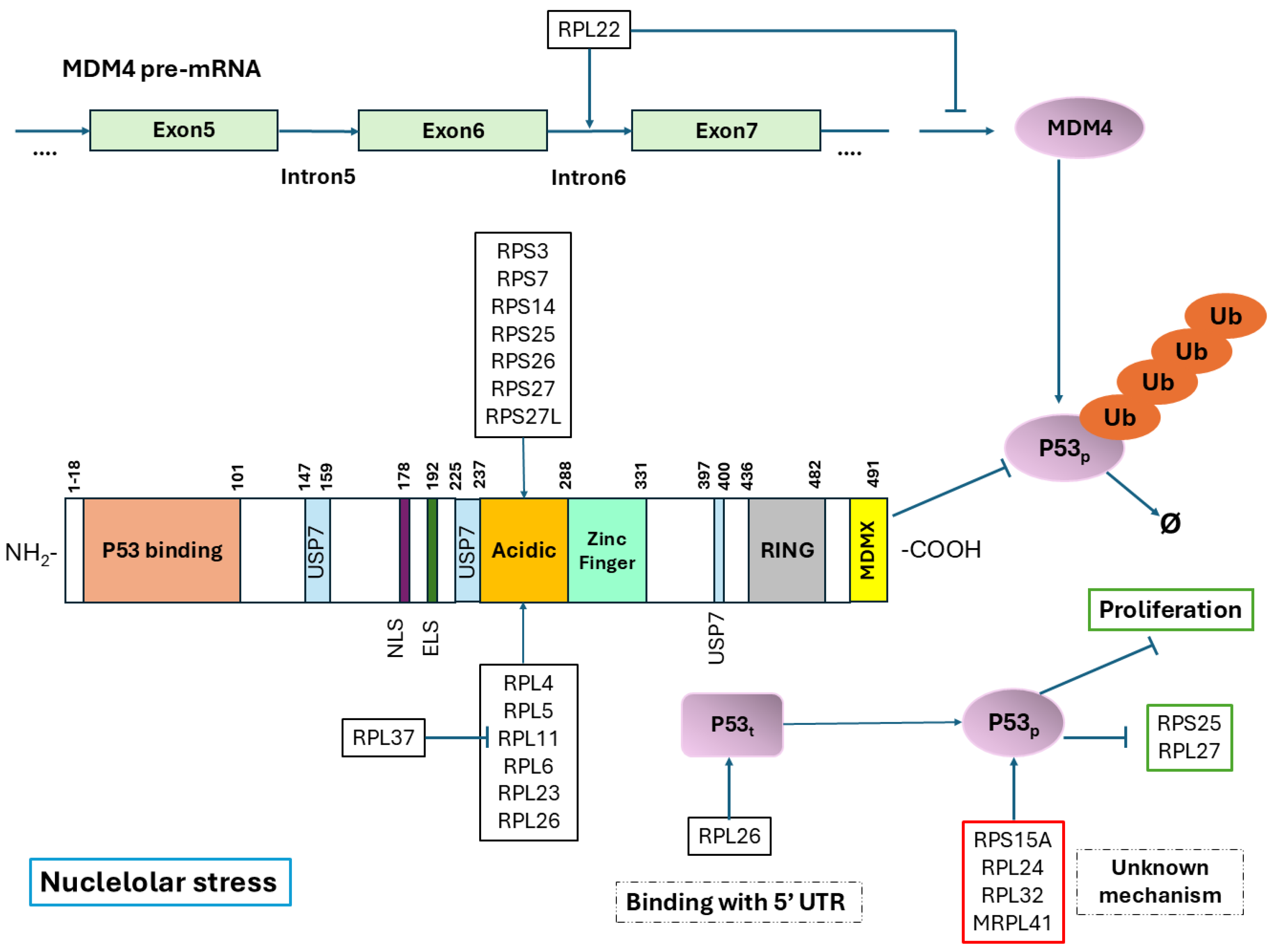 RPL22 is an interesting example of a ribosomal protein whose p53-regulating properties have been discovered recently. The work of [45] showed that RPL22 binds to intron 6 of MDM4 pre-mRNA, causing its inactivation through aberrant splicing (exon 6 is skipped and an incomplete form of MDM4 is created), which leads to reduced P53 ubiquitination.
