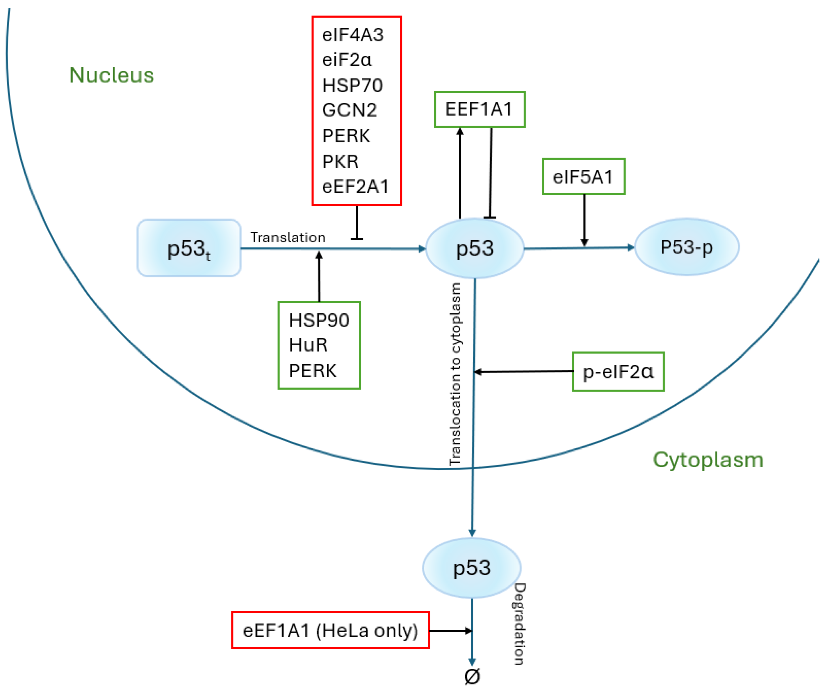 Elongation factors (eEFs) are equally critical in translation and have been implicated in p53 regulation. eEF1A1 and eEF1A2 are responsible for delivering aminoacyl-tRNAs to the ribosome, ensuring the precise addition of amino acids to the growing polypeptide chain. However, both factors have been shown to negatively regulate p53 expression. For example, studies on U2OS and HeLa cells demonstrated that eEF1A1 suppresses p53 levels [74], while eEF1A2 exhibits similar effects in liver cells [75]. These findings suggest that elongation factors can act as suppressors of p53-dependent stress responses, potentially influencing cell-cycle progression and apoptosis. Another work [76] showed that eEF1A1 can form a negative feedback loop with p53.