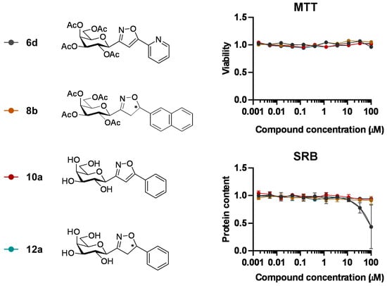 Toxicity or the inhibition of cell proliferation are pre-requisites for application as cancer chemotherapy agents. A subset of the compounds (6d, 8b, 10a, 12a) was assessed for rapid toxicity (MTT assay) and for the inhibition of cell proliferation (SRB assay), as described previously on human ovarian adenocarcinoma cell model (A2780) []. Compounds 8b, 10a, and 12a did not induce rapid toxicity or cytostasis (Figure 1). However, 6d induced cytostasis at 100 µM with a ~50% maximal inhibition without inducing rapid toxicity (Figure 1).