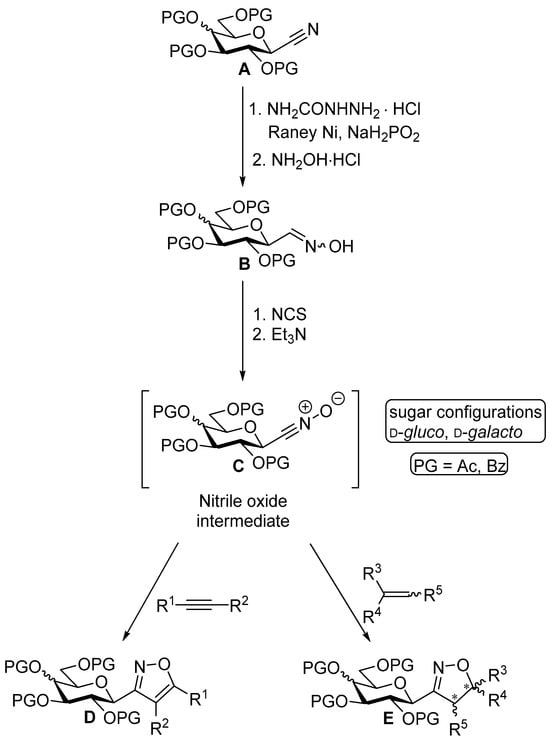 - Dondoni, A.; Giovannini, P.P. Formyl C-glycosides as precursors to glycosyl nitrile oxides and nitrones. Synthesis 2002, 2002, 1701–1706. [Google Scholar] [CrossRef]