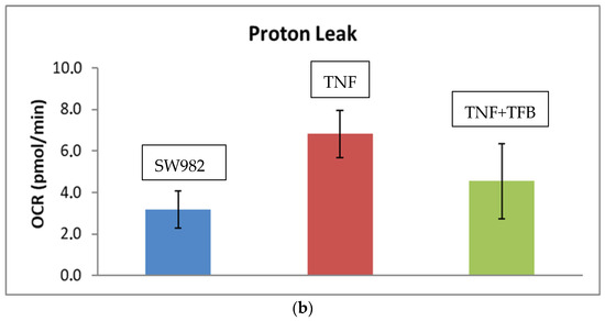 Legend (b): Blue line—control SW982 cells (untreated, unstimulated), red line—TNF-alpha-stimulated SW982 cells, and green line—TNF-alpha-stimulated SW982 cells, treated with TFB. The application of the three inhibitors allowed for the calculation of the ATP, maximal and reserve respiratory capacity, proton efflux, and non-mitochondrial respiration.