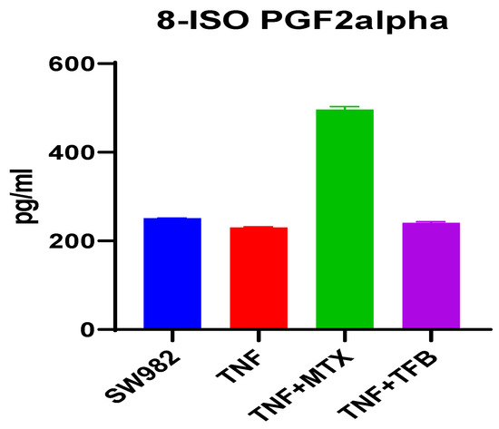 An increase of 8-isoPGF2alpha was found only in supernatants from TNF-alpha-stimulated and MTX-treated cells (mean difference: 266.4, 95% CI: 250.9–281.9, and p < 0.0001) (Figure 5). No statistically significant difference was observed in the other groups. The chromatograms can be seen in the Supplementary file—Figure S1c.