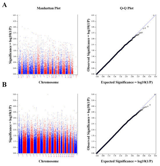 Manhattan plot and Q-Q plot of GWAS. (A): Illumina Infinium HumanExome BeadChip. (B): Affymetrix Axiom exome array (p value of the threshold line = 0.01).