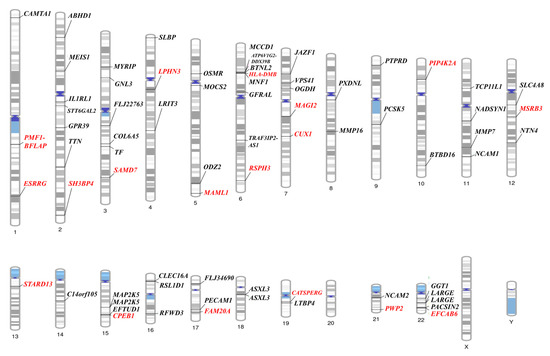 Significant gene areas where linkage with osteoporosis in the premenopausal women are represented using a phenogram (p < 0.05 in both the Illumina Infinium HumanExome BeadChip and the Affymetrix Axiom exome array. Red; p < 0.01). Gene names may appear more than once if multiple significant SNPs are located within the same gene.
