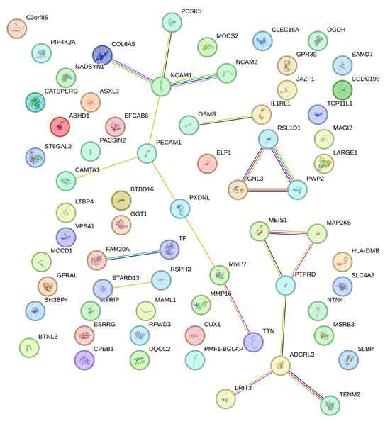 Figure 3 shows the protein–protein interaction (PPI) network of genes that were commonly significant (p-value < 0.05) in the Illumina BeadChip and Affymetrix Axiom exome arrays generated using the STRING database. Six clusters were distinguished through K-means clustering (K = 6). Genes within each of these clusters are likely to share similar biological functions. Among these genes, NCAM1, PECAM1, GNL3, and PTPRD appear to be hub genes with multiple interactions within the network.