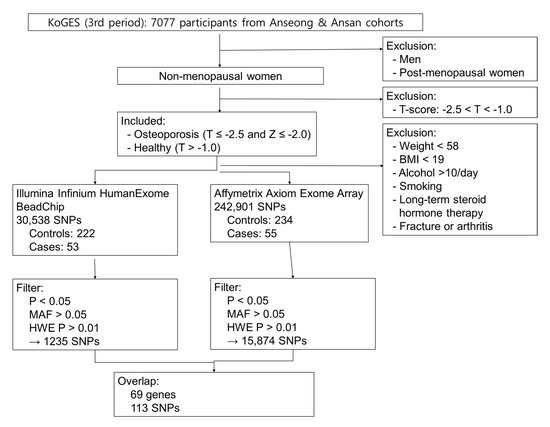 Therefore, in this study, we conducted a large-scale genetic analysis using data from both the Illumina Infinium HumanExome BeadChip version 1.1 and the Affymetrix Axiom Exome Array5.0, based on participants from the Anseong and Ansan cohorts of the Korean Genome and Epidemiology Study (KoGES). The aim of this study was to identify genetic variants associated with the development of osteoporosis in Korean premenopausal women.