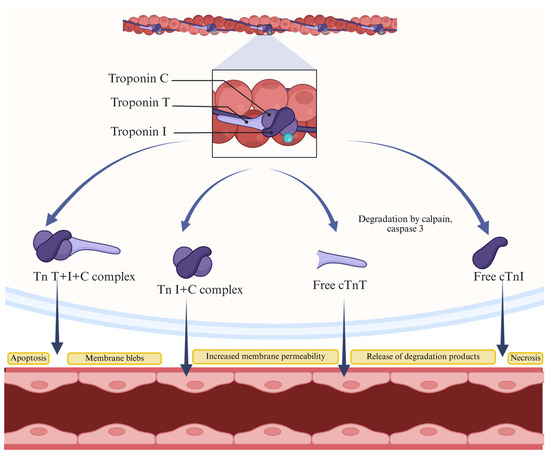 Cardiac Tn release is induced by necrosis and apoptosis (Figure 1) [57,58,59]. Apoptosis of cardiomyocytes includes an increase in the activity of the caspase enzyme, which can damage DNA and impair protein structures. While necrosis impairs membrane integrity, and the cell content goes into the extracellular space, apoptosis maintains the integrity of the cell [58].