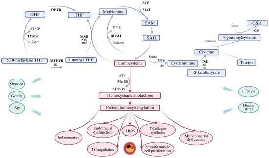 Hcy metabolism. Hcy metabolism involves remethylation to methionine and transsulfuration to cysteine (presented by blue arrows). Protein homocysteinylation can lead to cardiovascular diseases (presented by red arrows) and is influenced by various non-modifiable risk factors, such as genetics, gender, and age, as well as modifiable risk factors, including lifestyle and disease states (presented by green arrows). B2—Vitamin B2, B6—Vitamin B6, B12—Vitamin B12, CBS—Cystathionine β-synthase, CSE—Cystathionine γ-lyase, DHF—Dihydrofolate, DHFR—Dihydrofolate reductase, DMG—Dimethylglycine, dTMP—Deoxythymidine monophosphate, dUMP—Deoxyuridine monophosphate, GS—Glutathione synthase, GSH—Reduced glutathione, MAT—Methionine adenosyltransferase, MetRS—Methionyl-tRNA synthetase, MTHFR—Methylenetetrahydrofolate reductase, ROS—Reactive oxygen species, SAH—S-adenosyl Hcy, SAM—S-adenosyl methionine, THF—Tetrahydrofolate.