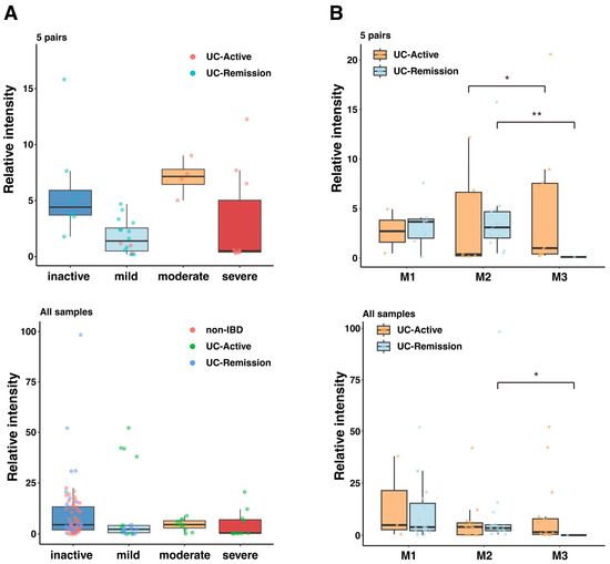 Next, the association of IgG reactivity with mucosal inflammation (Matts score) was evaluated (Figure 2B). Similar to the analysis based on disease severity, no significant differences in IgG reactivity were found among the three Matts score groups in either cohort. However, a stratified analysis separating the UC active and UC remission disease stages revealed a stage-dependent relationship. In the five-pair cohort, reactivity in the M2 group was significantly lower than in the M3 group in the active stage (p = 0.018). In contrast, during the remission stage, this relationship was reversed, with the M2 group showing significantly higher reactivity than the M3 group (p = 0.012). In the analysis using all samples, no significant differences were found among Matts score groups in the active stage. However, the finding for the remission stage was consistent, with the M2 group again showing significantly higher reactivity than the M3 group (p = 0.044).
